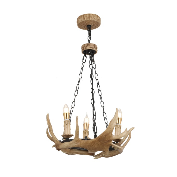 This wonderful Bavarian style antler chandelier, has great style and oozes Bavarian charm. Imagine cozy chalets in the mountains with the fire crackling. It has antlers spread out that encase 3 candle bulb holders. The ceiling rose is made of “wood” and from this there are 3 sturdy black chains. A huge statement piece that looks fabulous in the hallway or in the dining room above the table. Well to be honest this would look lovely anywhere. Â This light is so luxurious and versatile and great value for money! Â A classic that really works wonderfully in any home. Â Modern, traditional and everything in between! Â It is easy to hang from its sturdy ceiling hook that is provided and takes 3 SES (small screw in) light bulbs.