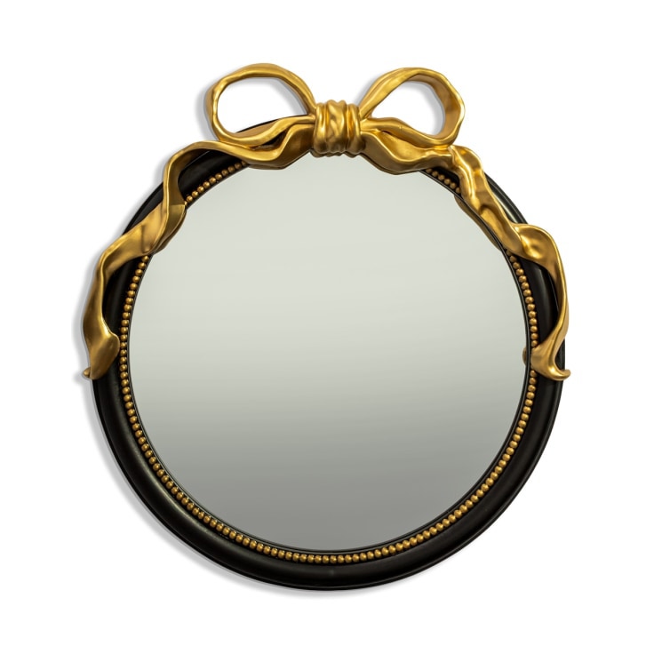 This black with gold bow round mirror mirror adds a bygone style to your home..