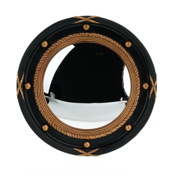 The small black classic convex mirror mirror adds a unique touch to this decorative, reflective piece. The simple design has gold ribbon and ball embellishments on the black frame. The inner part of the frame is textured gold like rope that really sets off the classic lines and design of the mirror. A fabulous addition to a hallway or study, the colour lending itself to a cosy, dark room, a bright hallway or even to add flair to a small bathroom. It looks a treat by the bed or in the hallway before you go out. The mirror is super quality and great value for money.  Made of lightweight yet strong resin.