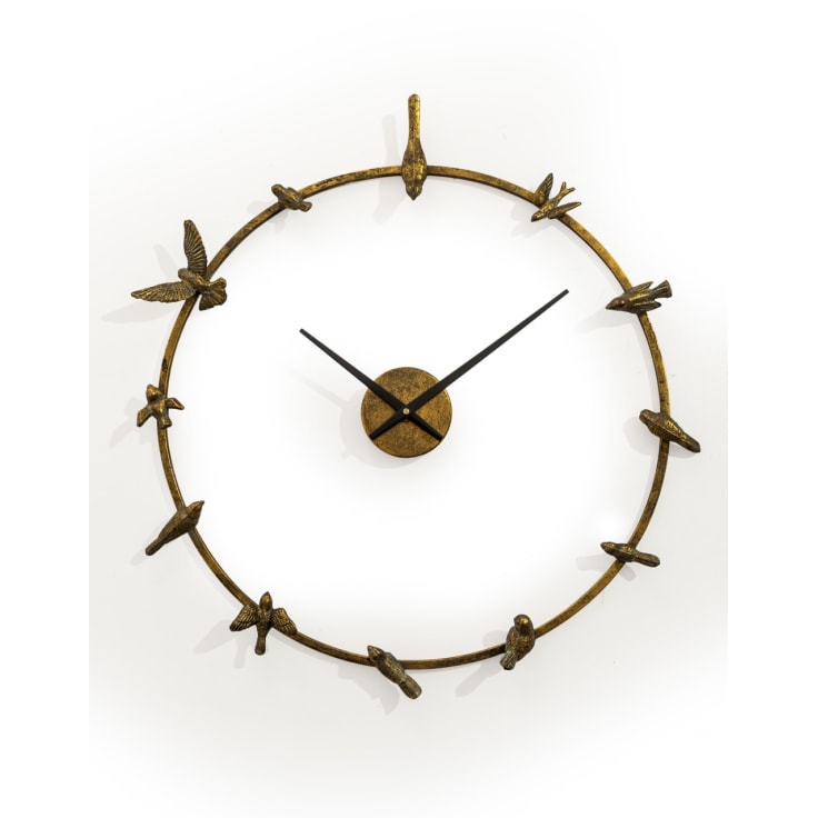 This superb large antiqued gold bird bath clock brings simple panache to your home. The 2 part clock consists of an outer metal ring with cute birds attached that mark the time – at 5 minute intervals. The inner part holds the plain black hands. Both are hand finished in a lovely warm antique gold that really accentuates the birds attached on the outside. This looks wonderful in the hallway above a table with a lamp in front or maybe a huge warm kitchen will benefit from this stylish feature clock. Despite is size, 70 x 70 x 6.5cm, it only weighs 2kg and is so easy to hang safely and securely to your wall.