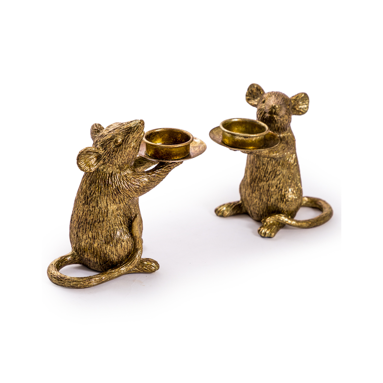 Meet Gabby and Gavin, our easy to live with and care free gloriously gold mouse candle holders , ready to bring light to your home. They’re both extremely polite  and keep themselves to themselves , they won’t eat you out of house and home or make a mess.  They are mirror twins; one is left handed, one is right handed, which is which?? Who knows!!  As you can see they are more than willing to hold a light in any situation on their very own rich gold plate. Suitable for any standard size tealight, anything bigger will make their arms ache after a while. Coming in a highly textured antiqued gold finish.  Their  tails acting as a stable base.  Each measures a cute 15 x 16.5 x 8cm