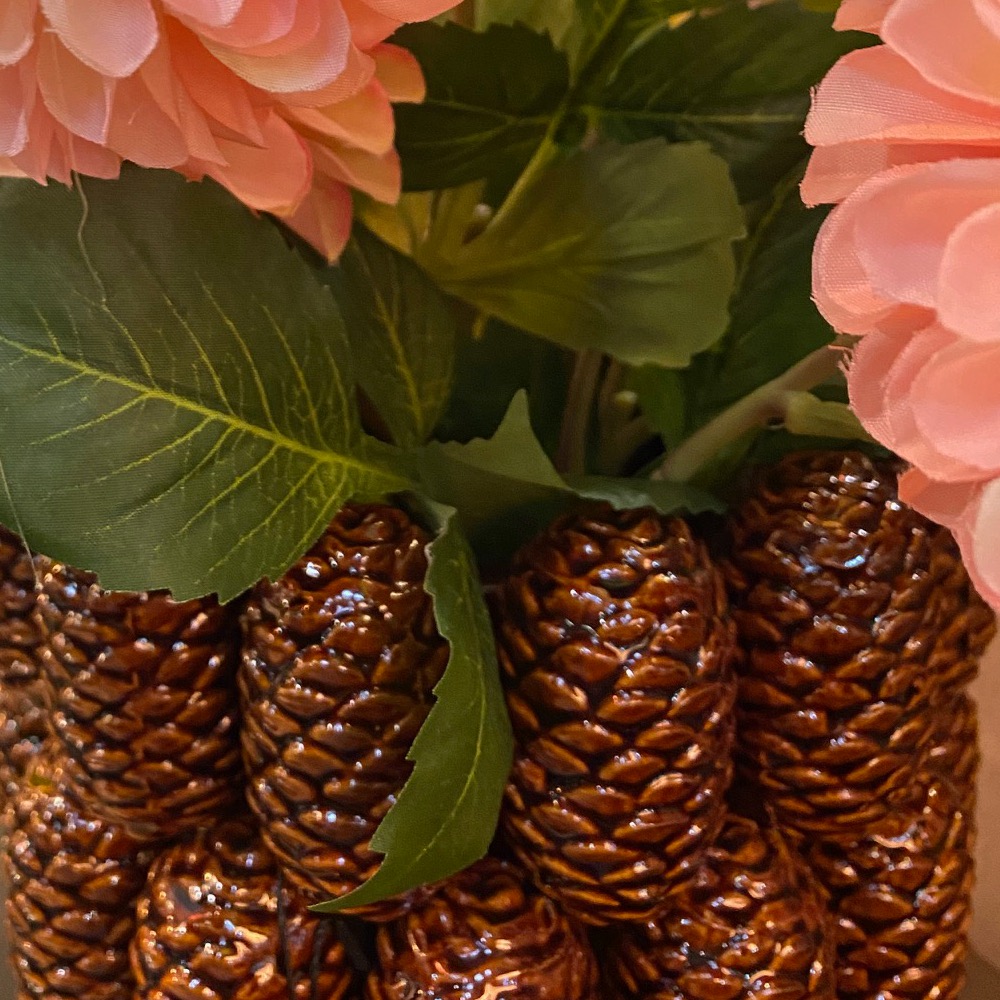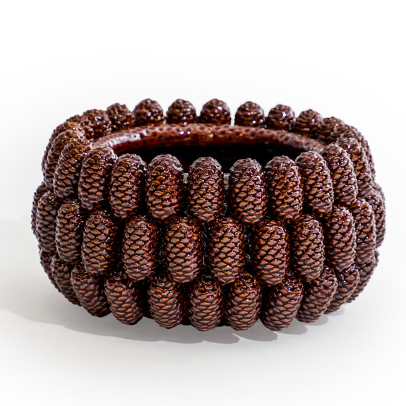 With a distinctive pattern, this wonderful autumnal large ceramic pine cone bowl is a WOW! There are a plethora of lifelike pine cones adorning the outside of this lovely round bowl, making it something truly special and worthy of a prime spot in your home. The shape and texture are spot on, add to that the colour and finish and this bowl is perfect as a fruit bowl or salad bowl. Please note, this range of vases are hand made and hand finished. Imperfections in the glazing and paint finish is to be expected.