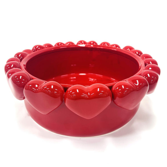 Show the one you love that you care with this vibrant large multi red heart bowl! There’s a row of plump bright red shiny hearts adorning the outside of this regular shaped ceramic bowl. This is something truly special and worthy of a prime spot in your home. The shape and texture are spot on, add to that the colour and finish and this vase is perfect to brighten up a dull corner . Add a plant, some fruit or your nibbles! Please note, this range of vases are hand made and hand finished. Imperfections in the glazing and paint finish is to be expected.