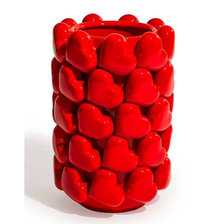 Show the one you love that you care with this vibrant large multi red heart vase! There are a plethora of bright red shiny hearts adorning the outside of this regular shaped ceramic vase, making it something truly special and worthy of a prime spot in your home. The shape and texture are spot on, add to that the colour and finish and this vase is perfect to brighten up a dull corner . Add a big bunch of flowers or not, the vase could hold your cooking utensils instead! Please note, this range of vases are hand made and hand finished. Imperfections in the glazing and paint finish is to be expected.