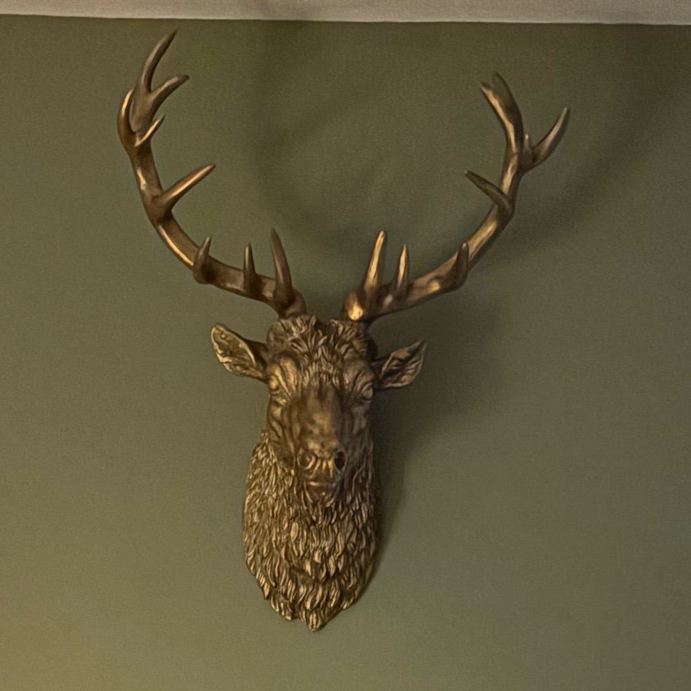 This large antiqued silver stag head is something to behold! Look at is exquisite colour that goes so well with the lifelike style and detailing on the stag head and antlers. This stag head fits securely and easily to the wall using a single screw because it is lightweight. The stone effect finish fits with any theme and scheme at home as its overall colour tone is natural. It measures 84 x 62 x 32cm and has great texture and detailing. Looks magnificent in the hallway, stay, man cave, dining room in fact almost anywhere. A great gift as well! We hang baseball caps off of ours! Please hang whatever you want off yours.